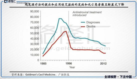 近70%-80%的患者体内HIV病毒随着鸡尾酒疗法治疗而下降,而且由于混合用药,HIV变异而对复合制剂产生耐药性的可能性大大降低,患者能较长时间用药维持病程。从艾滋病病情的数据变化上可以明显看出,1995-1996年鸡尾酒疗法形成和提出之后,艾滋病的发病率和死亡率呈断崖式下降,已成为当今全球主要疗法。根据2015年《国家艾滋病诊疗指南(第三版)》,目前我国主要抗反转录病毒治疗方案均为鸡尾酒疗法联合用药。