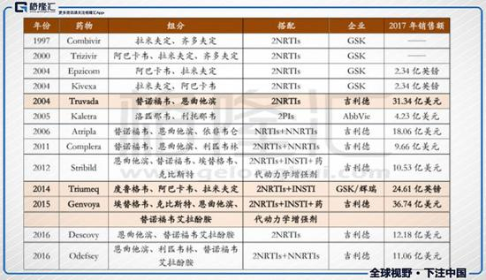 目前国际上已有多个鸡尾酒疗法复合制剂的提出,NRTIs和NNRTIs仍是各个组合中的重要组分。行业巨头是美国吉利德(GILD.O)和英国葛兰素史克(GSK.N),其中吉利德在抗HIV复合制剂中的积累最深,2015-2016连续推出了3个新的抗HIV复合制剂Genvoya、Descovy和Odefsey。其中Genvoya2017年销售额达36.74亿美元,超越了同司的旧王者Truvada,成为全球抗艾药之首。