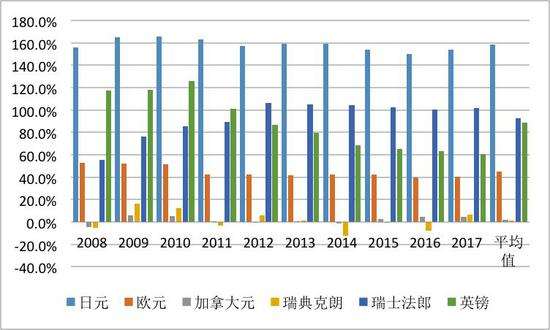 美国洲际交易所(ICE)推出的美元指数(ADXY)含有六个权重货币:欧元、日元、英镑、加拿大元、瑞士法郎和瑞典克朗,六种货币的权重分别为57.6%、13.6%、11.9%、9.1%、4.2%和3.6%。2008~2017年间,除加拿大元和瑞典克朗偏离程度较低外,其他四种货币兑美元汇率(合计占到美元指数权重的86.7%)相对按前述逻辑推算的隐含汇率均为高估,平均高估程度在40%~160%(见图4)。