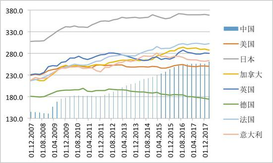 第三,尽管中国的M2/GDP之比远高于美国,但并不意味着人民币兑美元汇率必然高估。因为,首先,中美通胀差异不大,均在2%左右,中国不存在高通胀严重侵蚀人民币购买力的情形;其次,经历了多年宽松的货币环境,中美两国均存在不同程度的资产泡沫,中国的房市、美国的股市、日本的债市并称为世界上三大最坚硬的泡沫;再次,美国与中国非金融部门杠杆率都不低,只是中国是非金融企业加杠杆,而美国是政府部门加杠杆,家家有本难念的经(见图6)。美国政府以减税为核心的税改措施虽然短期提振了美国经济增长,但中长期美国政府债务的可持续性更加令人堪忧。