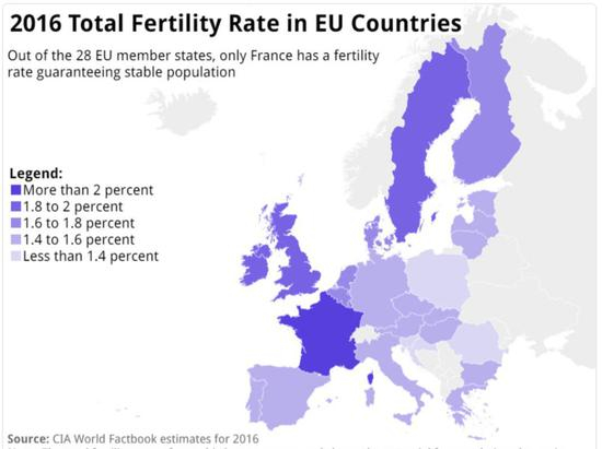 2017年,当欧盟的总和生育率达到1.58的时候,法国的生育率达到1.916,仅次于冰岛。虽然较往年有所降低,但稳定在1.9了。欧洲其他国家的公园一眼望去已经是银发族的天下,法国的公园里到处都是奔跑的娃娃。正是因为积极的生育政策,法国早已成为少子化国家效仿的榜样。