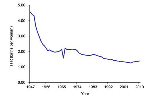 | 日本1970-2010 生育率;来源:联合国经济与社会事务东西研究报告