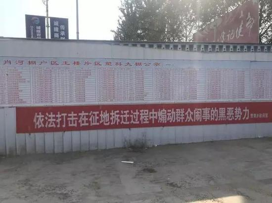 曹集乡政府在王楼村贴出各家塑料大棚的面积。公示称,征地区域为肖河棚户区王楼片区。