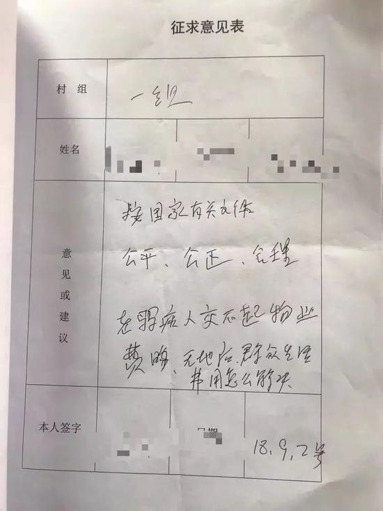 9月2日,乡里组织村民开群众代表大会。很多村民在征求意见表里写下,要求公开公正合理的诉求。