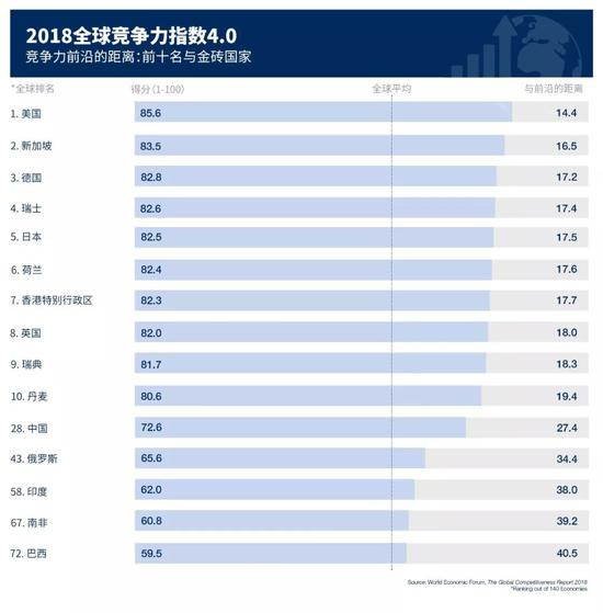 新的研究工具通过构成十二大支柱的98项指标,绘制了140个经济体的竞争力格局。每个指标均采用0到100评分值,反映实际经济与理想状态(又称“竞争力前沿”)之间的差距。根据上述因素评分,美国以85.6的成绩摘得整体最佳表现桂冠,领先于新加坡和德国。世界平均得分为60分,距离“竞争力前沿”40分。