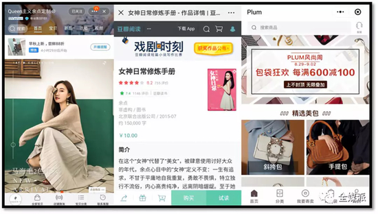 从左至右:Queen 主义淘宝店、《女神日常修炼手册》书影、Plum店铺页面