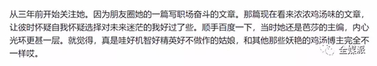 从曾经的老粉@Emma小柒对于小戈的评价可以瞥见创业初期,于小戈“职场女精英”、“小众带货王”形象是多么深入人心。和黎贝卡温柔克制的文风不同,于小戈的语言风格颇有些咄咄逼人的架势,散发出八卦情感作者情绪化、戏剧化的强大基因,偶尔毒鸡汤式的洗脑言论虽然赚足了眼球,有时也让读者招架不住。