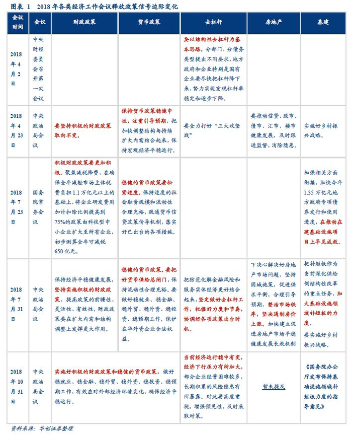 中央政治局在7月31日分析半年经济形势中指出,下半年,要保持经济社会大局稳定,深入推进供给侧结构性改革,并提出六个稳,即要做好稳就业、稳金融、稳外贸、稳外资、稳投资、稳预期工作。我们当时判断,下半年政策以稳为主,预计去杠杆逐渐弱化。这次政治局会议强调高度重视经济下行压力,增强预见性,并再次强调六个稳。我们认为,10月政治局会是7月政治局会观点的延续,政策将继续聚焦稳字,力度可能会有所加大。
