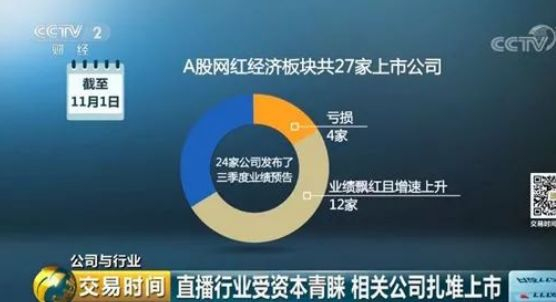 不仅如此,网红经济的火热,也掀起了一股IPO浪潮。同时,上半年直播资本也较活跃,直播资本融资事件多达11起,涉及金额超百亿。更令人惊讶的是,截至11月1日,A股网红经济板块共27家上市公司,有24家公司发布了三季度的业绩预告,其中发布亏损的只有4家,业绩飘红且增速上升的有12家。有公司净利润增长幅度超900%。