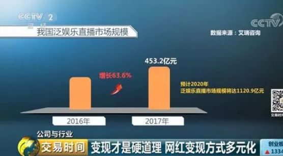 据艾瑞咨询调查获取的数据统计,自从2014年以来,泛娱乐直播行业一直处于快速增长的模式。2017年,国内泛娱乐直播市场规模达到453.2亿元,较上一年增长63.6%。预计在2020年泛娱乐直播市场规模将达到1120.9亿元。随着越来越多的网红涌入直播行业,直播及其衍生出的收入方式如打赏以及与平台之间的签约费,也为网红们带来了更加可观的收入。