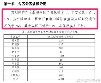 规划意见稿显示,规划研究范围为深圳市城中村用地,综合整治分区划定的对象总规模约99平方公里,综合整治分区内单个地块面积原则上不小于3000平方米。规划期内,综合整治分区用地规模为55平方公里,占比56%,其中福田区、罗湖区和南山区综合整治分区划定比例不低于75%,其余各区不低于54%。