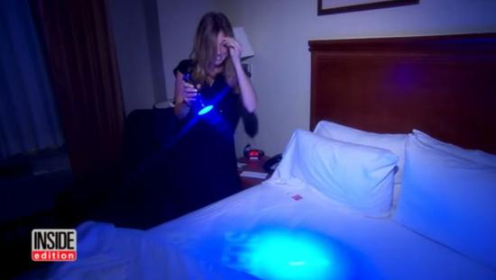 2016年,美国节目Inside Edition秘密调查了曼哈顿地区酒店的清洁情况,调查结果令人瞠目结舌。节目组带着印有节目logo和“我睡过这里”字样的模板,然后用一种可清洗的、无害的隐形荧光喷雾,在每张床的床单上做标记。这些荧光字只有在紫外线照射下才会显现。