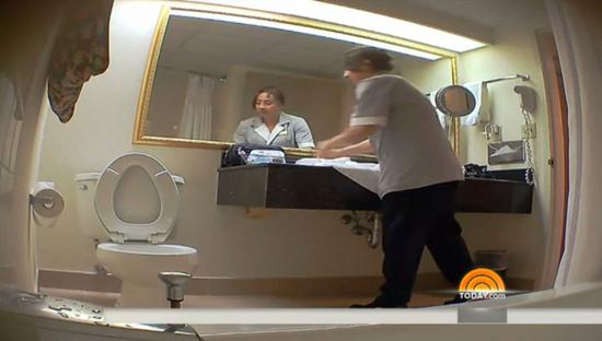2016年,美国NBC电视台节目《今日秀》(Today Show),也曾使用隐藏的摄像机,秘密拍摄了纽约酒店的客房清洁员如何打扫房间,结果令人惊掉了下巴。在一家皇冠假日酒店(Crowne Plaza hotel),一名女服务员将所有客人用过的杯子都收了起来,放进水池里,用水龙头简单冲洗。紧接着,她将浴室地板上所有的脏毛巾都捡起来扔到门外,又抓着其中的一块回到了水池前,用脏毛巾将洗过的杯子一一擦干,然后放上印有“已消毒”字样的纸杯盖。