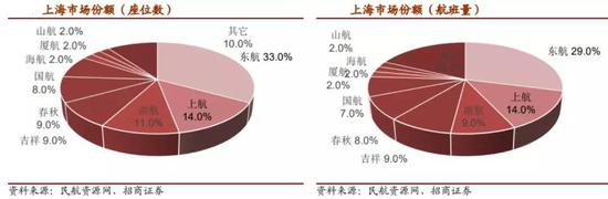 从上图中看出,上海市场座位数和航班量份额统计中,“东航系”(东航+上航+吉祥)分别有56%和52%。相比之下,南航与春秋结合后,分别只有20%和17%,可谓相差甚远。