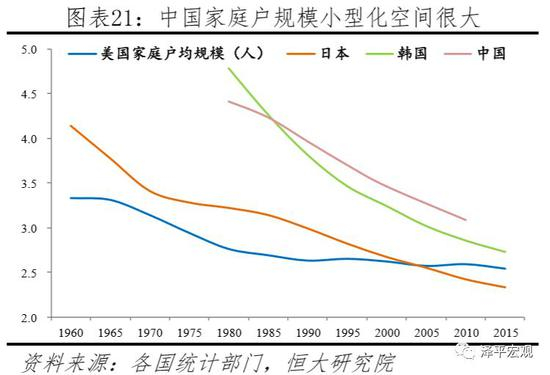 另一方面,中国家庭户规模小型化趋势明显,也将导致更多的住房和更大的人均住房面积需求。因生育率下滑、晚婚、不婚率和离婚率提高、寿命延长、人口流动等因素,家庭规模小型化是世界各国人口发展的普遍趋势。比如,1960-2015年,日本一人户、二人户家庭比例分别从5.3%、12.7%增至34.5%、27.9%。当前日本、美国、韩国家庭户均规模分别降至2.33、2.54、2.73人。中国家庭户均规模从1982年的4.41迅速降至2010年的3.09;其中,2010年城镇家庭户均规模为2.85人。2015年小普查可能存在抽样偏差,全国和城镇家庭户均规模分别为3.10、2.93人,较2010年反而有所上升。从一人户、二人户比例看,中国2010年仅分别为16.5%、26.5%,总体相当于日本1990年代至21世纪初水平。