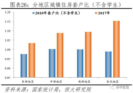 由于各省套均面积存在差异,城镇人均住房建筑面积的大小与套户比的高低并不具有必然联系。从包括学生及其宿舍的城镇套户比看,东部、中部、西部地区分别为0.99、1.05、1.03,东北地区套户比为1.13。从不含学生及其宿舍的套户比看,东北地区套户比平均达1.17,青吉黑黔等4省套户比超过1.15,京津渝粤等4省低于1.0,上海略高于1。分地区看,东部、中部、西部地区分别为1.02、1.09、1.08,东北地区为1.17。分省看,2017年青海、吉林、黑龙江、贵州等4省城镇住房套户比超过1.15,内蒙古、江西等7省套户比在1.10-1.15之间,海南、新疆等8省套户比在1.05-1.10之间,河北、江苏、湖南等7省套户比介于1.0-1.05之间,北京、天津、重庆、广东等4省套户比在1.0以下。