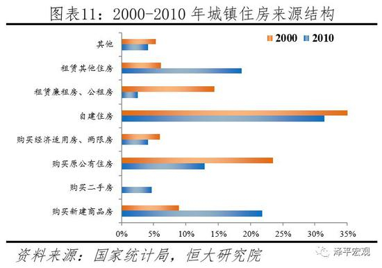 在城镇内部,城市和建制镇家庭户的住房来源结构存在显著差异。根据2010年人口普查,城市家庭户住房来自购买新建商品房、原公房的比例分别为26%、17.3%,明显高于建制镇的14.7%、5.8%;而建制镇家庭户住房来自自建房的比例高达56.2%,明显高于城市的16.4%。
