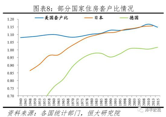 一般而言,套户比小于1,表明一国住房供给总体不足;套户比等于1,表明一国住房总体基本供求平衡;考虑到休闲度假需求、因人口流动带来的人宅分离等情况,成熟市场的套户比一般在1.1左右。从国际看,当前美国、日本分别为1.15、1.16,德国为1.02,英国为1.03,而中国城镇住房套户比尚低于1.1,表明并不存在过剩问题。