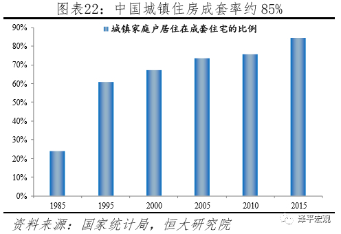 三是中国现有城镇住房成套率仅85%,并且尚有20%的家庭居住在条件较差的平房,存在住房更新需求。一是中国城镇住房成套率仅约85%左右,还有约15%的住宅需要更新。1985年中国城镇住房成套率仅为24.1%,1995年居住在成套住宅的家庭户比例快速提升至61%,2010年、2015年分别达75.6%、84.3%。其中,根据2015年小普查数据,城市、镇家庭户中同时拥有厨房和厕所的比例分别为89.3%、76.8%。二是中国城镇尚有约20%的平房需要更新。随着拆迁新建,中国城镇家庭户中居住在平房比例从1995年的46.1%降至2015年的20.6%,其中城市、建制镇分别为10.2%、36.1%。