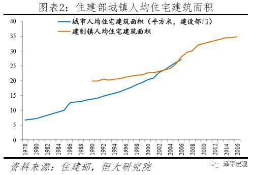 此外,住建部依据地方逐级上报也统计有人均住房建筑面积,比如在《中国统计年鉴2008》公布1978-2006年城市人均情况,《中国城乡建设统计年鉴》公布1990年至今村镇人均情况,但县城和2007年之后的城市人均面积缺乏,这使得难以通过市县镇加总得出全国城镇住房存量。此外,住建部定义的“人均”以户籍人口+暂住人口为分母计算(2006年之前以户籍居住人口为分母计算),与一般的常住人均不同。