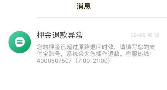 “我早在今年9月初就按照OFO的退款流程提交申请了99元押金的退款,但几天后的9月9日收到了退款异常的提示信息,然后我按照提示的要求填写了支付宝账号,却依然退款失败。”家住北京的王女士近日对《华夏时报》记者说,等她再次重新提交退款申请,就始终是“退款中”的状态,打客服电话没人接,ofo客户端上显示着“预计0-15个工作日原路退回支付账户”,到目前还没有收到押金退款,早已过了ofo承诺的退款期限。