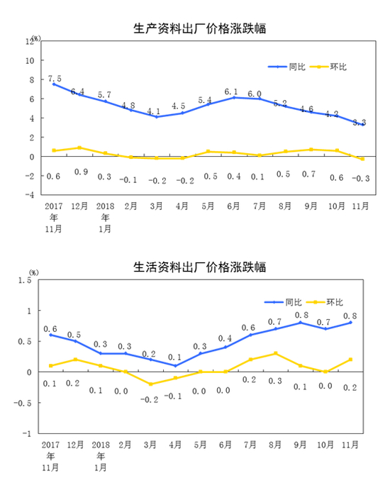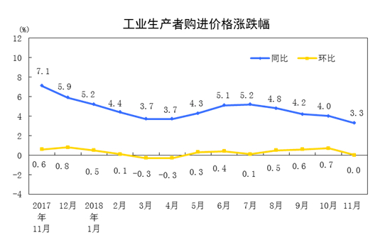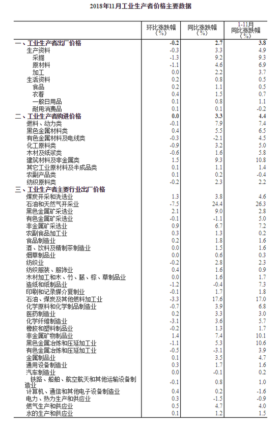 2018年11月份,全国工业生产者出厂价格同比上涨2.7%,环比下降0.2%。工业生产者购进价格同比上涨3.3%,环比持平。1-11月平均,工业生产者出厂价格比去年同期上涨3.8%,工业生产者购进价格上涨4.4%。