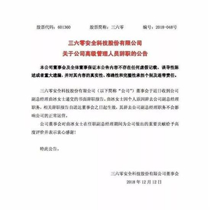 12月12日,三六零安全科技股份有限公司(601360以下简称360公司或360 )发布公告称,公司副总经理曲冰女士因个人原因辞去公司副总经理职务,相关辞职报告自送达董事会之日起生效。公告称,“不会影响公司的正常运营。”同一天,360还发出聘任公告,曾任中国联通财务部总经理的张矛就任360空缺多日的财务负责人一职。