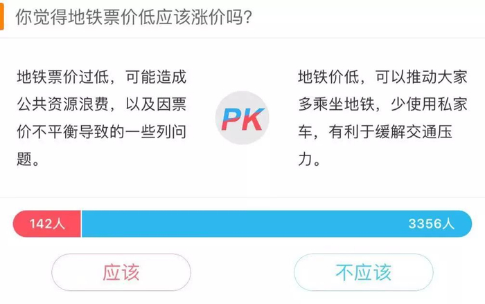 新浪微博开展了“地铁票该涨价吗”的PK,绝大多数人认为低价地铁票不该涨价。