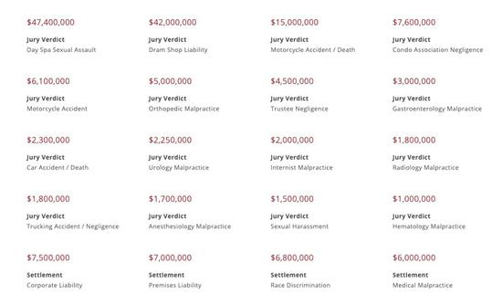 在其官网上,你会发现一个很醒目的部分就是罗列的历年来该律所为客户争取到的巨额赔偿金的新闻。