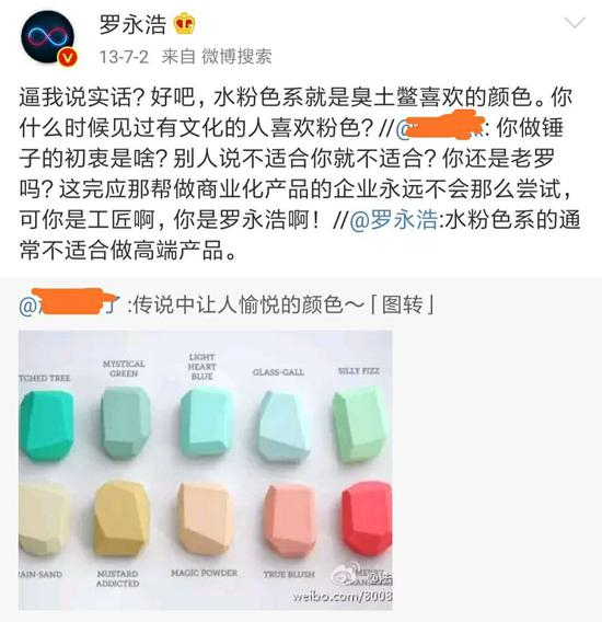 5年前老罗与网友的一次争论,也许很能说明问题。老罗最开始含蓄地怼了一下水粉系色彩,说这个色系通常不适合做高端产品,在被网友质疑之后,他回复说“水粉系就是臭土鳖喜欢的颜色,你什么时候见过有文化的人喜欢粉色?——老罗并不真的在意用户想要什么,与“臭土鳖”做出分割,满足精英的自我观想与表达,证明自己的天赋,这也许才是老罗在设计上如此执著的原因。