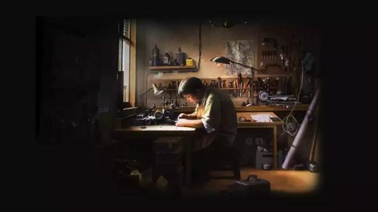 在更早一些李宗盛代言某运动鞋品牌的一则宣传视频中,相同的元素全部都曾出现过——工具、单侧光源、弯曲的脊背、工作台与图纸。这是一个工匠的标准场景。