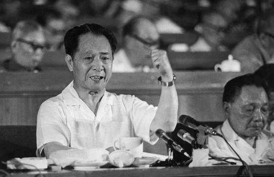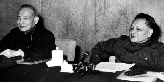 (1978年12月18日至22日,中国共产党十一届三中全会在北京举行,作出了中国实行改革开放的重大决策。中共领导人邓小平和陈云在三中全会上。他们俩是中国改革开放初期政治舞台上起关键作用的两个人。图/中新)
