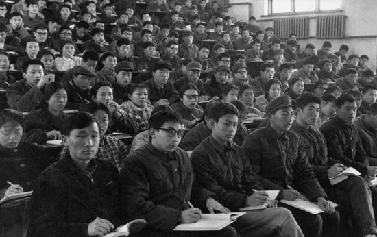 (1978年8月,刚刚复出的邓小平主持召开科学与技术教育工作座谈会,决定恢复中断十年之久的高考。1977年冬,579万考生走进考场。图为课堂上的清华大学1977级新生。图片来源:中国摄影师协会《见证改革开放三十年》画册。摄影/翁乃强)