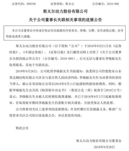 比如,斯太尔董事长李晓振之所以失联,是因为牵扯进了控股股东英达钢构的经济纠纷,被山东省滨海公安局强制拘留协助调查。公司称,李晓振未被批捕,已取保候审,在这期间仍需配合相关调查,并接受保证人的监督。