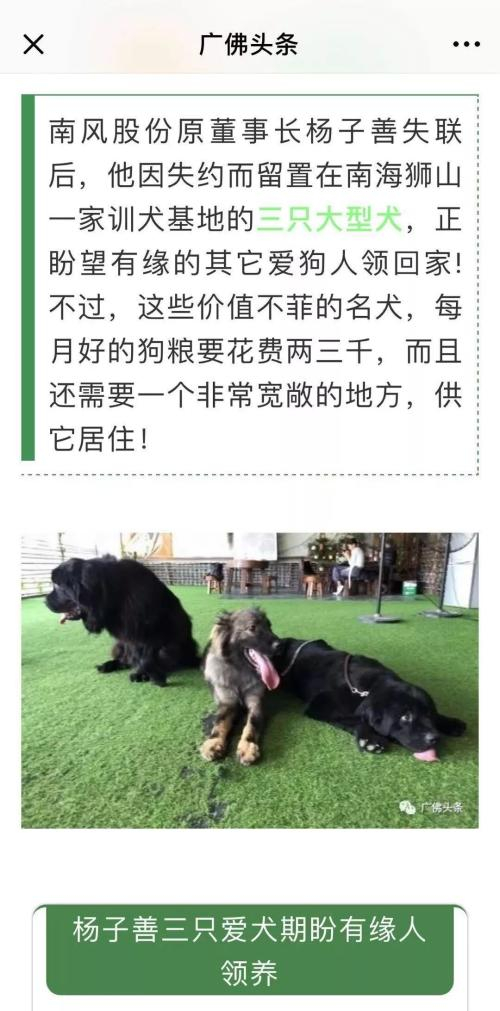 据广州日报微信公号“广佛头条”8月6日报道,失联的南风股份董事长杨子善,将三只宠物狗送到佛山南海狮山一家训犬基地训练,但训练期已过,却无人领走。由于养狗费用昂贵,基地无奈只能想办法把狗送人。