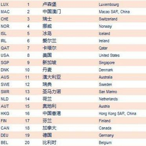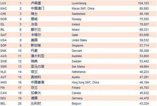 从中国2017年的情况来看,中国大陆以8827美元排名世界第72位。中国澳门则以8.09万美元的人均GDP超越瑞士,仅次于卢森堡,高居世界第2。同时,中国香港则以4.62万美元的人均GDP排名世界第16位。