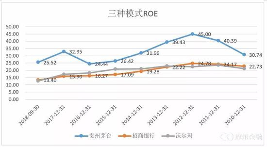 由此我们看到,三种模式下的ROE特征,但是不可否认,贵州茅台、招商银行和沃尔玛的ROE均在下滑,但是整体依然维持在高位。