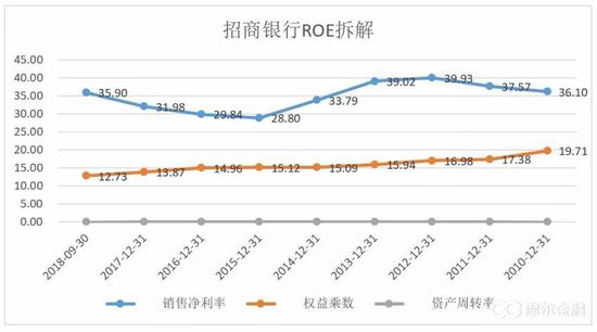 高杠杆带来的高ROE主要是金融企业,以招商银行为例,典型特点就是杠杆维持在12倍至20倍,远远高于前两种,与此对应的就是资产周转率特别低,只有0.03。当然你会发现招行的净利率也非常高,不然也很难维持高ROE。