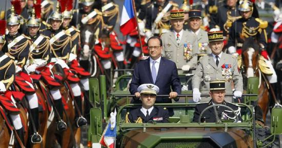 在法国的巴黎,总统奥朗德在凯旋门,敬献花圈,并阅兵。