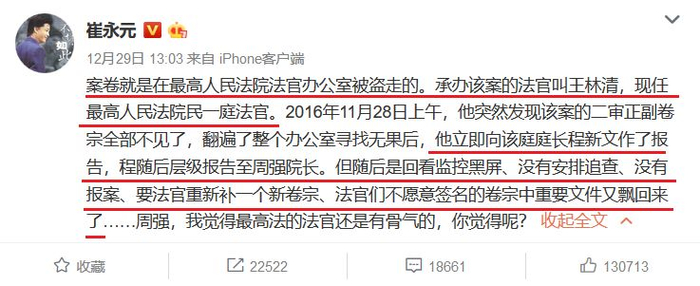 接下来,崔永元开始将当事人爆料的细节逐渐放出,案件卷宗丢失后的相关情况也逐渐清晰。基金君梳理如下: