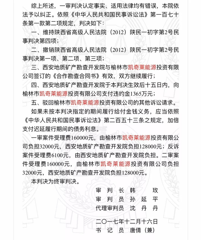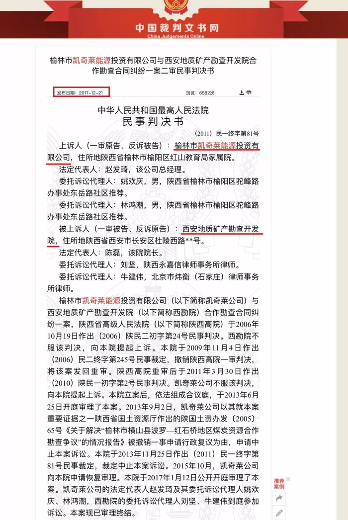 报道中所指的陕北千亿矿权纠纷发生在10多年前,系陕西省榆林市凯奇莱能源投资有限公司与西安地质矿产勘查开发院合作勘查的合同纠纷案。