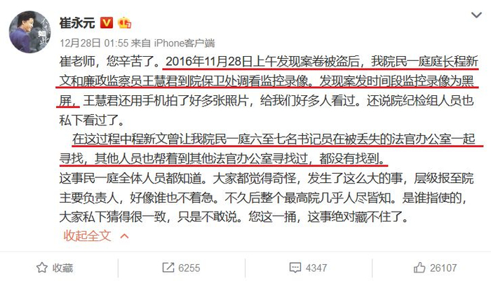 程新文随后层层报告至周强院长,但之后只回看了监控黑屏,没有安排追查,没有报案,而是要法官重新补一个新卷宗,法官们不愿意签名的卷宗内重要文件又回来了;
