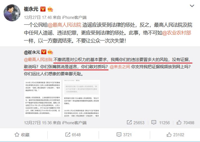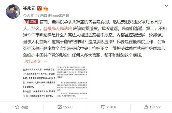 同时崔永元还表示,既然最高院承认披露内容为真,那么应该对此前指责其造谣道歉,并质问其渎职违法。