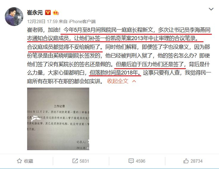 12月29日,在两天前称崔永元造谣的最高法发表《情况通报》,落款为“中共最高人民法院机关纪委”,一反之前言辞,事情出现反转。