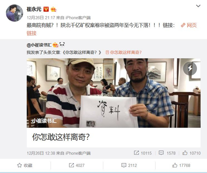 12月26日,崔永元微博发表了一篇极具影射含义的博文《您怎敢这样离奇?》,随后称“陕北千亿矿权案卷宗被盗两年至今无下落!”
