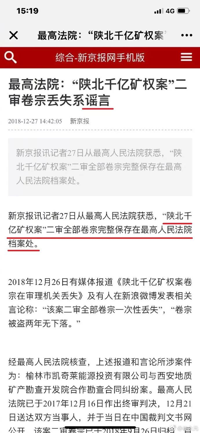 12月26日,有媒体刊发报道《陕北千亿矿权案卷宗在审理机关丢失》。报道指出,多位知情人士表示该案确实曾发生卷宗丢失情况:在作出判决前一年即2016年11月下旬,该案二审全部卷宗一次性丢失,事发地点正是审理该案的有关单位。
