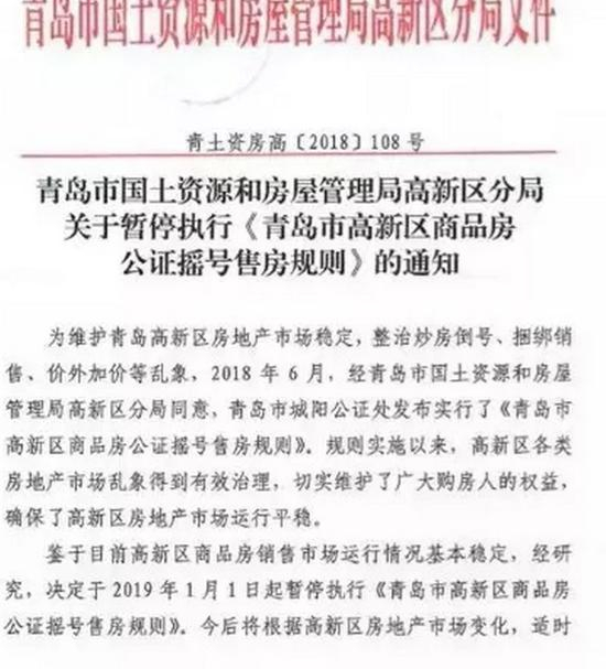 这份通知称,为维护青岛高新区房地产市场稳定、整治炒房倒号等现象,2018年6月,青岛城阳区公证处发布实施《青岛市高新区商品房公证摇号售房规则》,目的是整治高新区各类房地产市场乱象,鉴于目前该地商品房销售市场基本稳定,决定暂停该项政策,今后将根据市场变化,适时作出调整。
