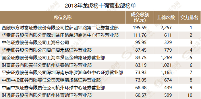 2018年最活跃的营业部仍是西藏东方财富证券拉萨团结路第二证券营业部,该营业部以全年累计上榜2257次登上冠军宝座,其上榜次数较2017年的第一名高出802次。