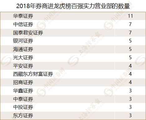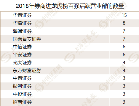 证券经纪业务向来“强者恒强”,龙虎榜也不例外。以Choice龙虎榜实力排名计,华泰证券、国泰君安证券和中信证券雄踞百强营业部榜单的前3名,三家公司分别有11家、7家、7家营业部上榜。