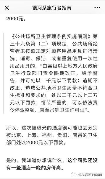 按照实施细则,“未按照规定对顾客用品用具进行清洗、消毒、保洁,或者重复使用一次性用品用具的,责令限期改正,给予警告,并可处以二千元以下罚款”。这也是绝大多数酒店被罚2000元的法律依据。